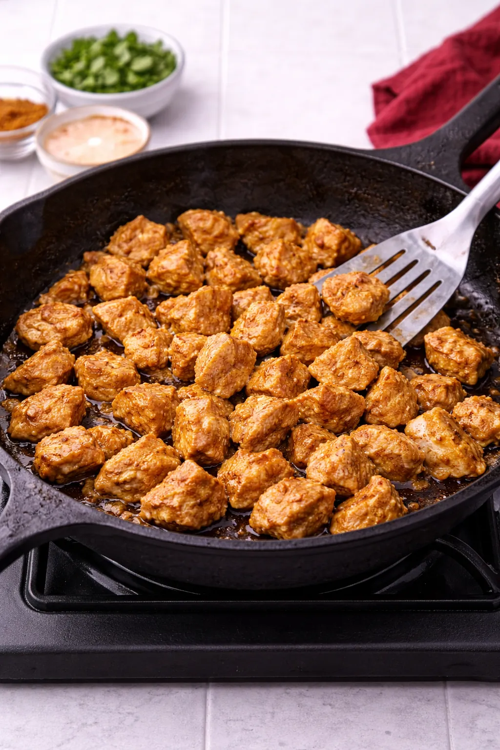 The chicken does not need to cook fully yet — it will finish cooking in the sauce.