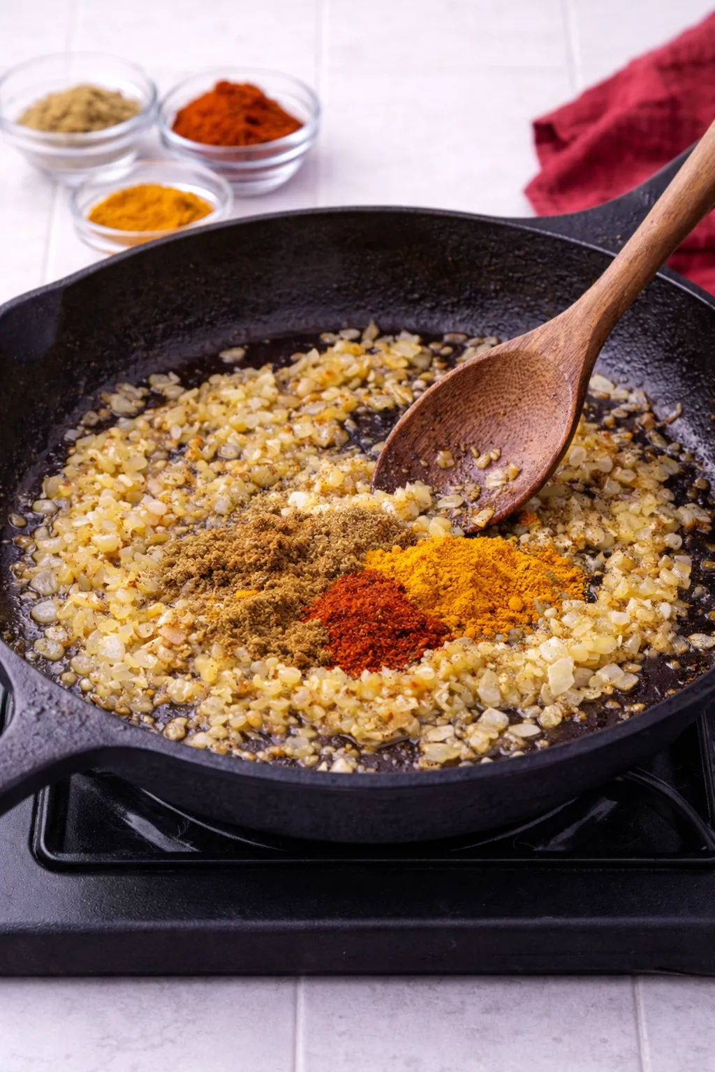 Add diced onion and cook 5–6 minutes until soft and golden.