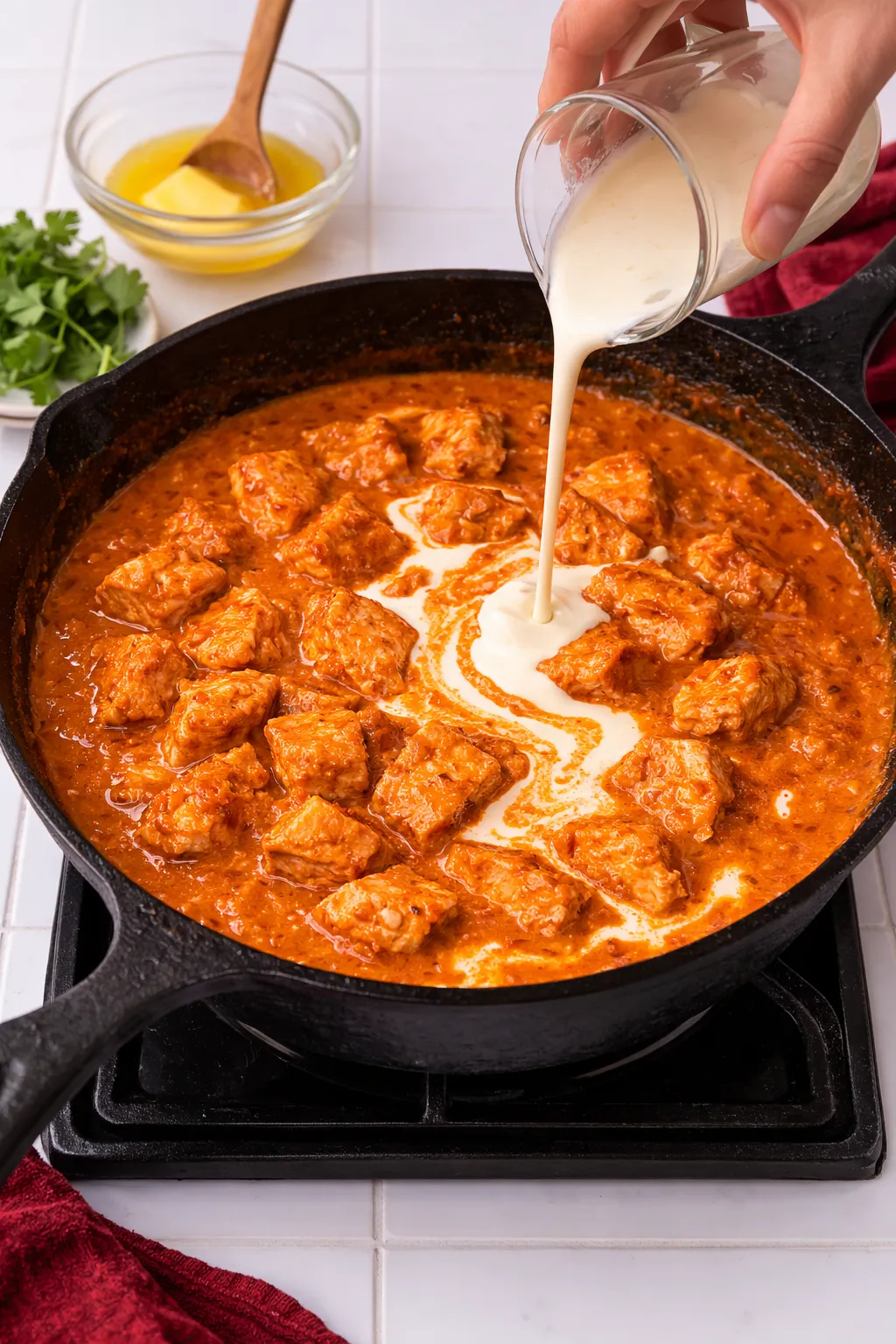 Tender pieces of marinated chicken simmer in a rich tomato cream sauce layered with warm Indian spices and finished with butter. Serve with warm flatbread, rice, or roti for a comforting and flavorful meal.